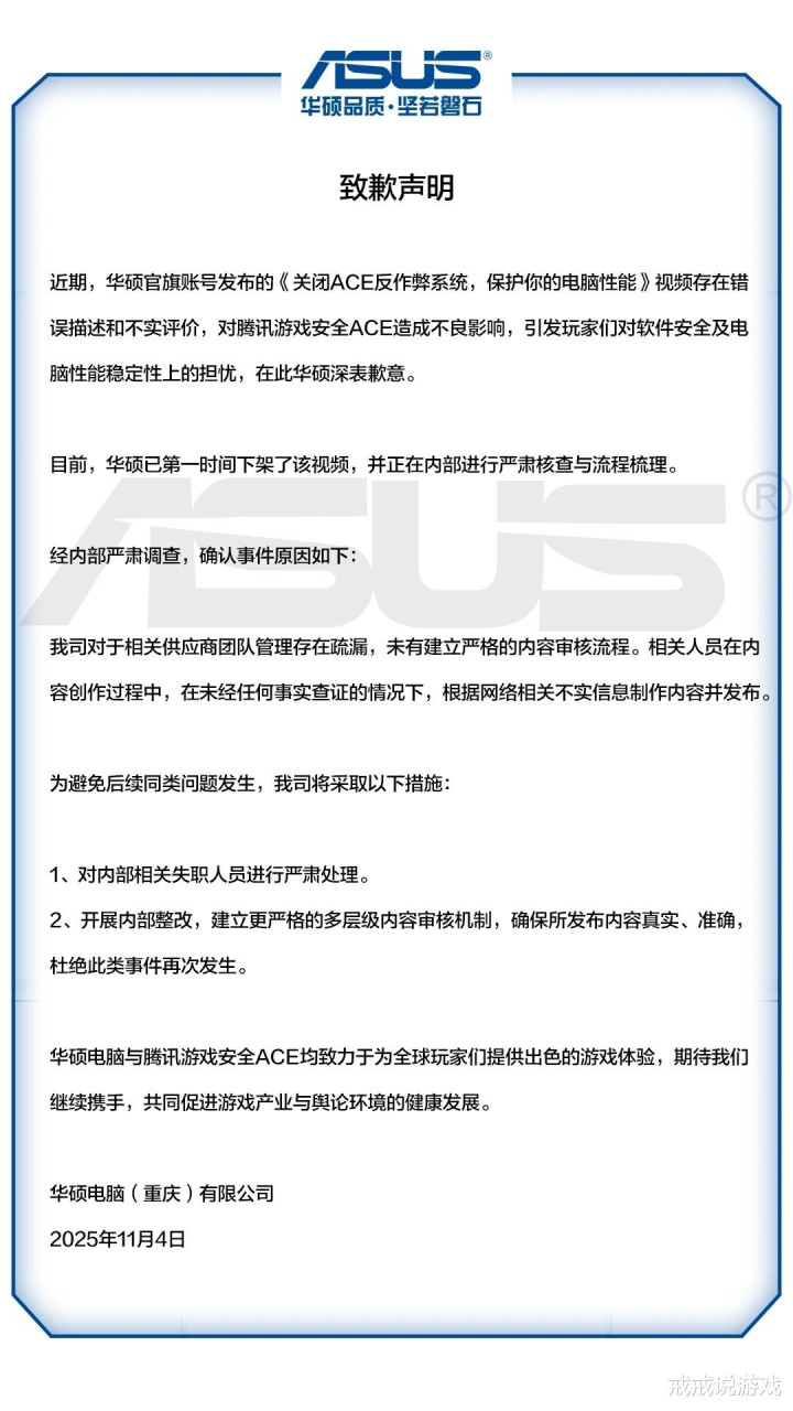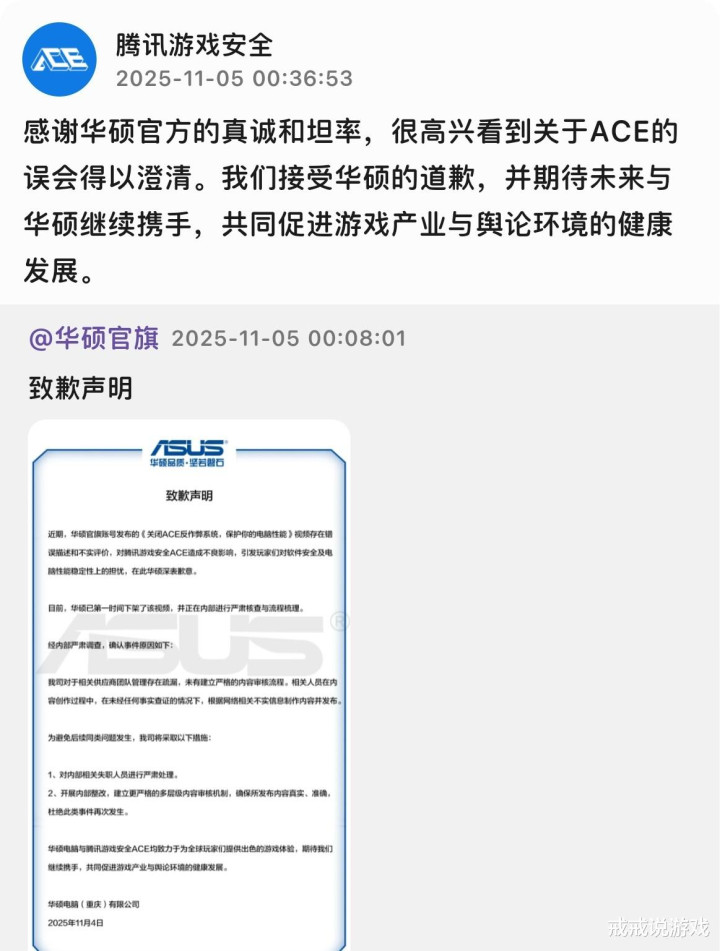 就在大家期待腾讯如何回应时,事情出现了意想不到的转变。华硕突然下架了引发争议的视频,并于11月4日发布了官方致歉声明。华硕在声明中表示,先前发布的视频存在错误描述和不实评价,对腾讯游戏安全ACE造成不良影响。他们对此深表歉意。这则突如其来的道歉让众多围观网友措手不及。有网友调侃道,这波操作好比团战开打后ADC突然向对方道歉,让人摸不着头脑。更令人惊讶的是华硕道歉的速度。从发布视频到下架道歉,整个过程不过几天时间,这种光速反转在科技圈实属罕见。